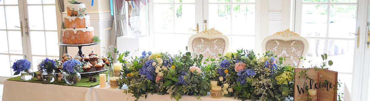 ブーケやテーブル装花のコンビネーションにとどまることなく、バンケットルーム全体を含めた会場設営まで行うことができます。